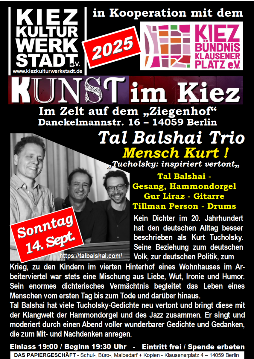 Tal Balshai hat viele Tucholsky-Gedichte neu vertont und bringt diese mit der Klangwelt der Hammondorgel und des Jazz zusammen. Er singt und moderiert durch einen Abend voller wunderbarer Gedichte und Gedanken, die zum Mit- und Nachdenken anregen.